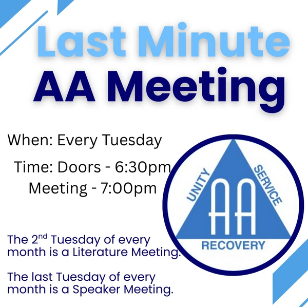 On Tuesday nights, we host the Last Minute AA Meeting. This is an OPEN meeting of Alcoholics Anonymous. All are welcome.